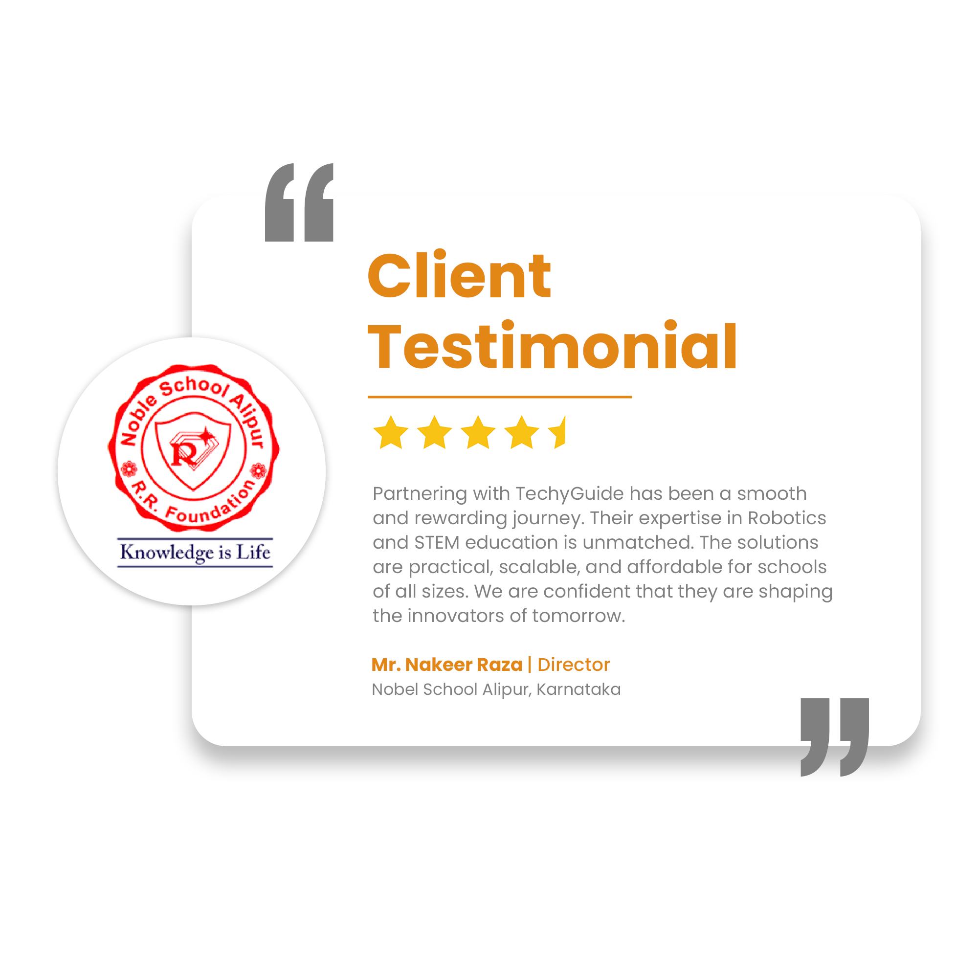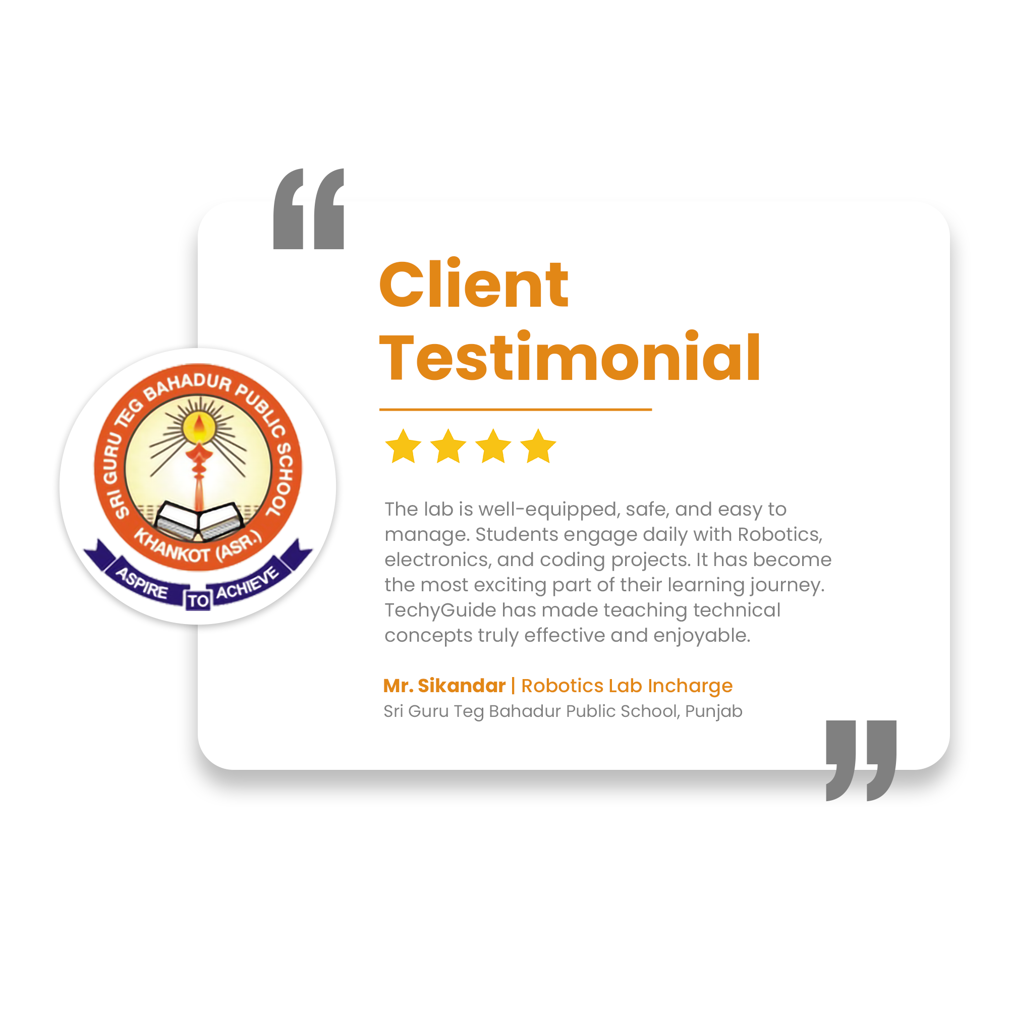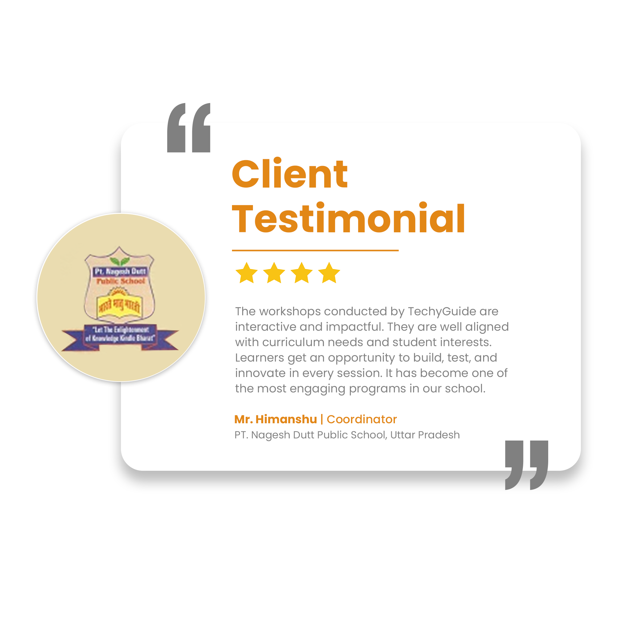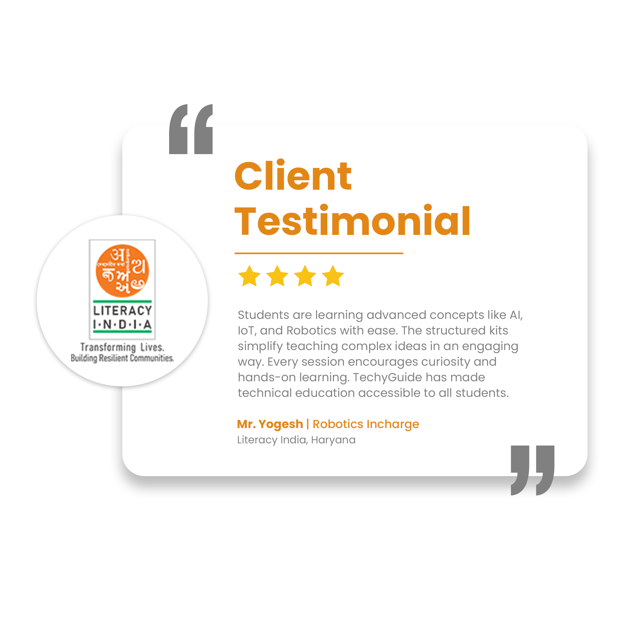 Through CSR-driven STEM Workshops, TechyGuide has engaged schools with innovative learning, equipped teachers with modern tools, and inspired students with practical exposure. These efforts are fostering educational empowerment and fueling the nation’s progress.